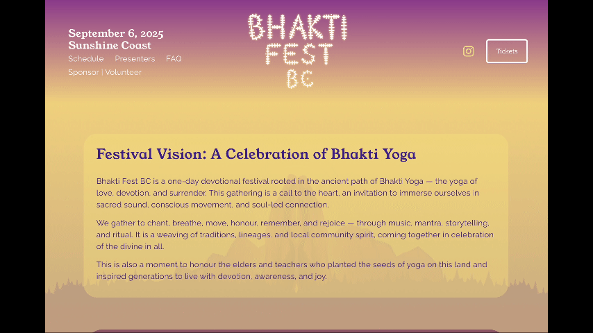 Bhakti Fest 2025 was a one day festival in Gibsons, BC on the beautiful Sunshine Coast. A full day of programming including Kirtan, Yoga, Breathwork, and Conscious Dance. I was part of the organizing team that brought this festival to life, with a focus on design, branding, website, as well as coordinating behind the scenes operations. I also presented a 45 minute long set at the festival!